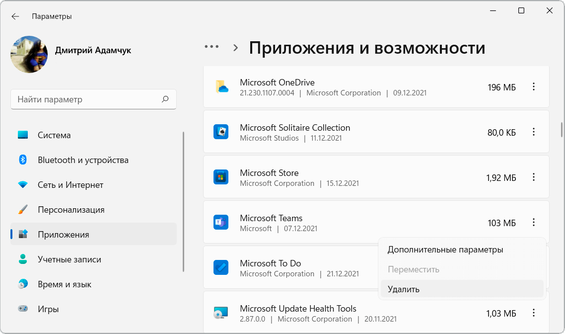 Собственно, с приложениями и компонентами всё просто: ненужное — удаляете. Подраздел Параметры > Приложения > Приложения и возможности. На примере предустановленного Microsoft Teams напротив него выбираю Ещё (вертикальное троеточие) и дважды Удалить…