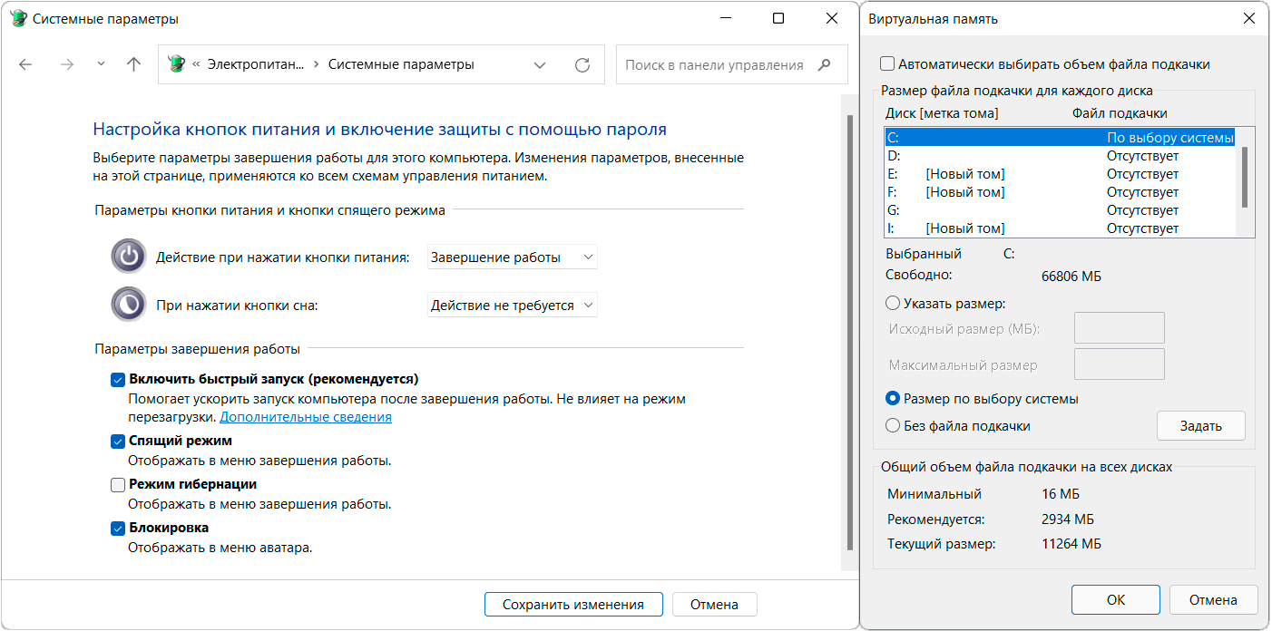 | Можно просто выключить Режим гибернации и Спящий режим. В разделе Электропитания классической Панели управления. | Вместо Автоматического выбора объёма можно указать значение Без файла подкачки. У меня файл hiberfil.sys весит 11 Гб. |
