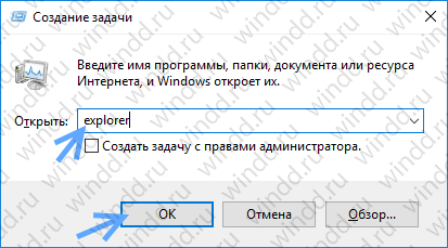 - И в окне создания задачи вводим название приложения Explorer или Explorer.exe и для запуска нажимаем кнопку ОК.